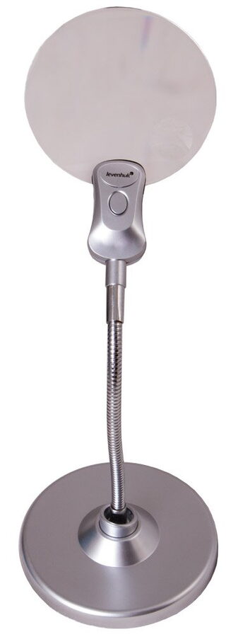Jedna pevná čočka (2 x) v sobě má menší čočku s přiblížením 6x. Pevná lupa má průměr 107 mm a menší 24 mm. Ohebný krk přístroje zakončuje stabilní základna ve stříbrné barvě. Osvětlení ve spodní straně lupy pracuje s 2 LED, které jsou napájené třemi LR1130 bateriemi.