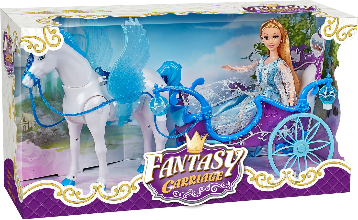 Magický kočár modrý s Pegasem a panenkou - světlo, zvuk