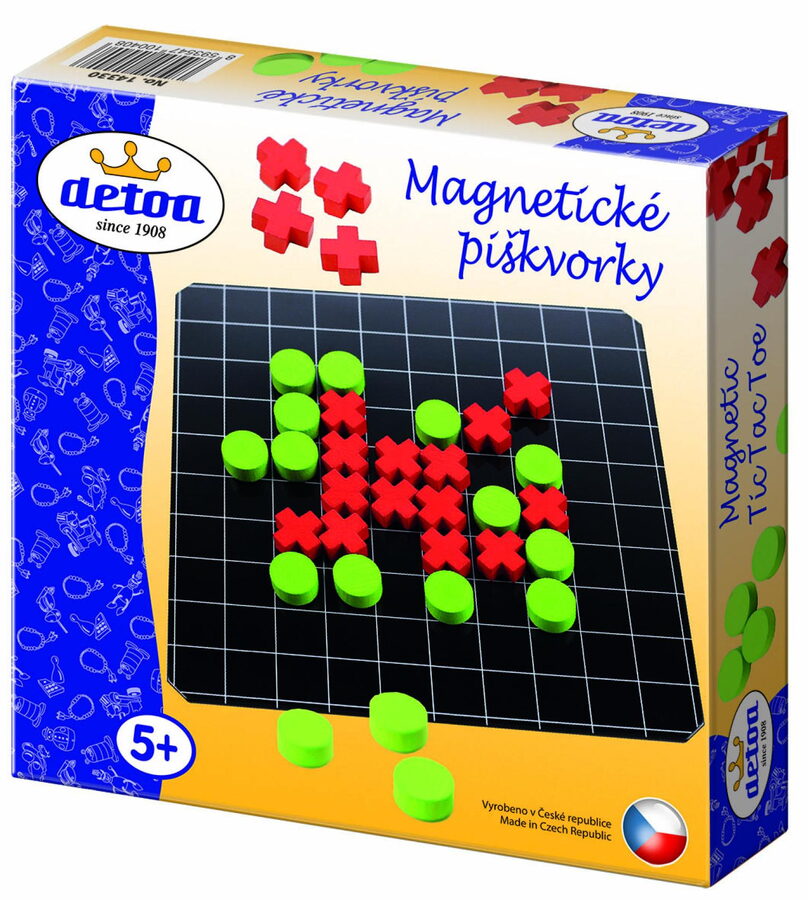 Oblíbená strategická, zábavná hra pro všechny generace v cestovním provedení. Výrobek obsahuje dřevěné hrací kameny (kolečka, kříže) a plechovou tabulku potištěnou čtverečkovou sítí. Rozměr výrobku 200x200x37mm Tabulka má rozměry165x165mm, velikost herních kamenů je 15x7mm Baleno v papírové krabičce Doporučeno pro děti od 5 let České dřevěné hračky Detoa jsou vyráběny z kvalitního dřeva, které se těží v horských oblastech střední Evropy. Pro barvení se používají pouze kvalitní, certifikované a ekologické barvy a laky, které vyhovují normě EN 71 a nezatěžují životní prostředí. Protože jsou hračky určeny převážně nejmenším dětem, je technologickému procesu a kompletaci věnována zvlášť vysoká pozornost, která zaručuje stálou a vysokou kvalitu výrobků. Dřevěné hračky firmy Detoa se řadí mezi nejkvalitnější a nejestetičtější dřevěné hračky, které jsou v současnosti na evropském a tuzemském trhu k dostání. Nákupem hraček povedete své děti k rozvoji motorických schopností, estetickému cítění a kladnému vztahu k přírodnímu materiálu - dřevu.
