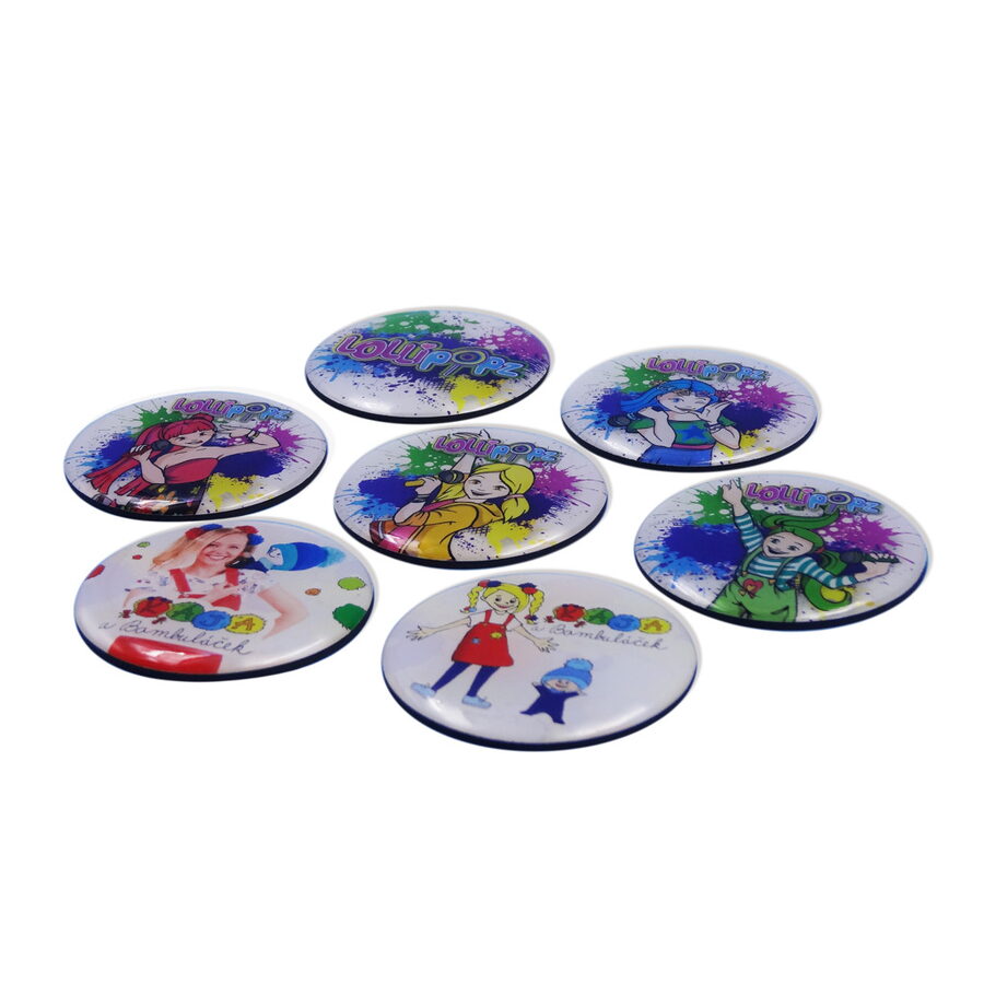 Luxusní pryskiřicová Magnetka LOLLIPOPZ. Průměr 45mm, assort 5 designů. Pro děti od 3let.