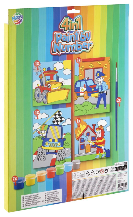 Kreativní sada pro malé malíře! Tento set obsahuje 4 různé obrázky s motivy pro kluky, které si děti mohou sami vybarvit podle čísel. Každé číslo odpovídá určité barvě – malování je tak snadné, zábavné a zároveň rozvíjí trpělivost, soustředění a jemnou motoriku.Obshuje 4 předtištěné kartonové obrázky, sada akrylových barev, štětec, návod.