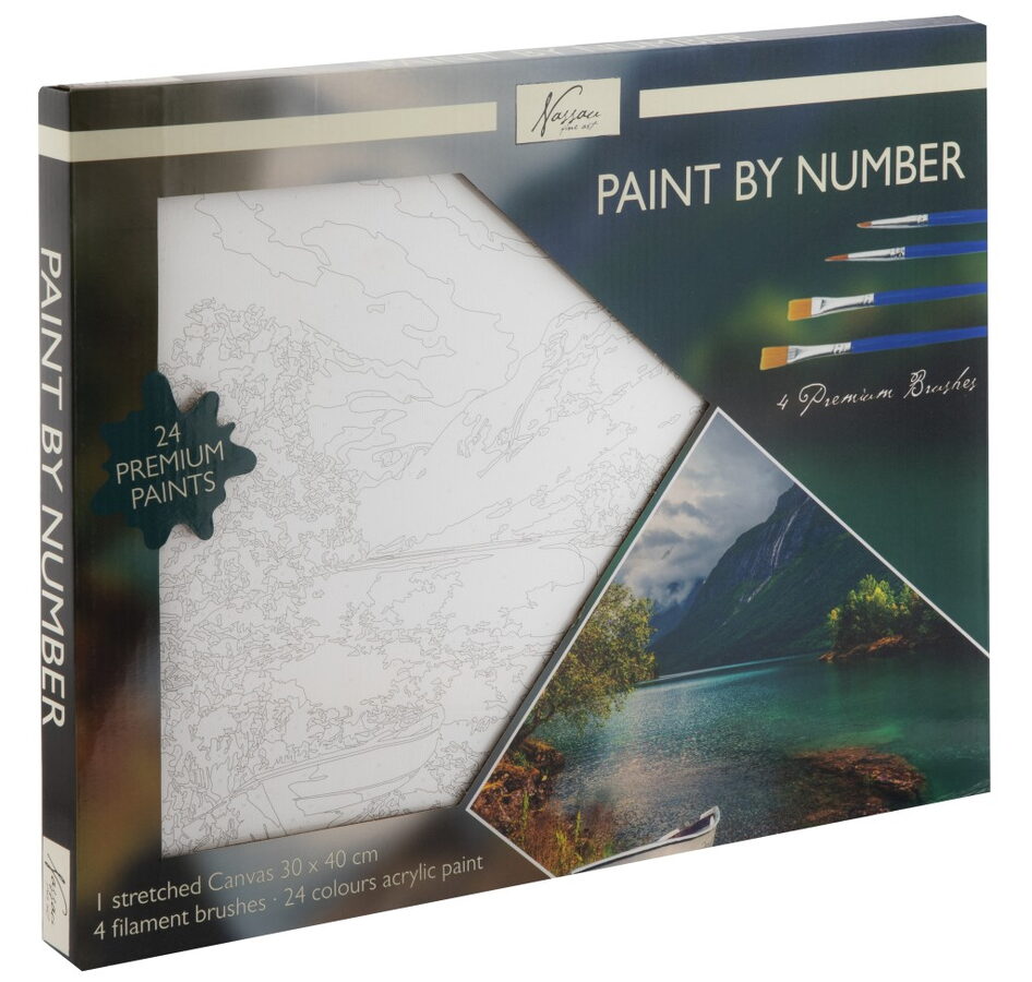 Malování podle čísel na na plátno Krajina 30×40 cm – namalujte si svůj obrázek pomocí čísel, které jsou již předtištěné. Součástí balení je 24 akrylových barev, plátno 30×40 cm s předtištěnými čísly, 2 ploché štetce a 2 kulaté štětce.