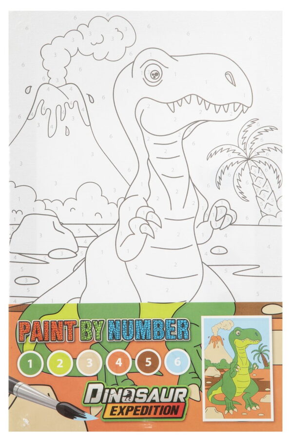 Malování podle čísel + vodovky Dinosaurus – balení obsahuje obrázek dinosaura s čísly + 6 ks vodových barev a štětec. Dva různé druhy.