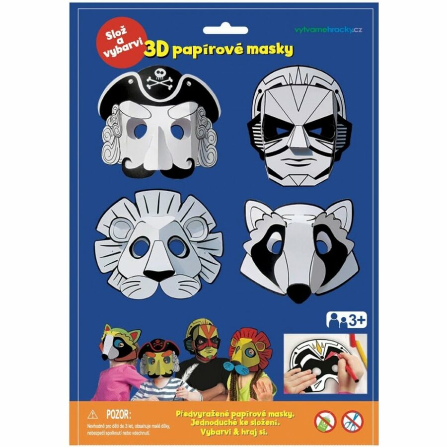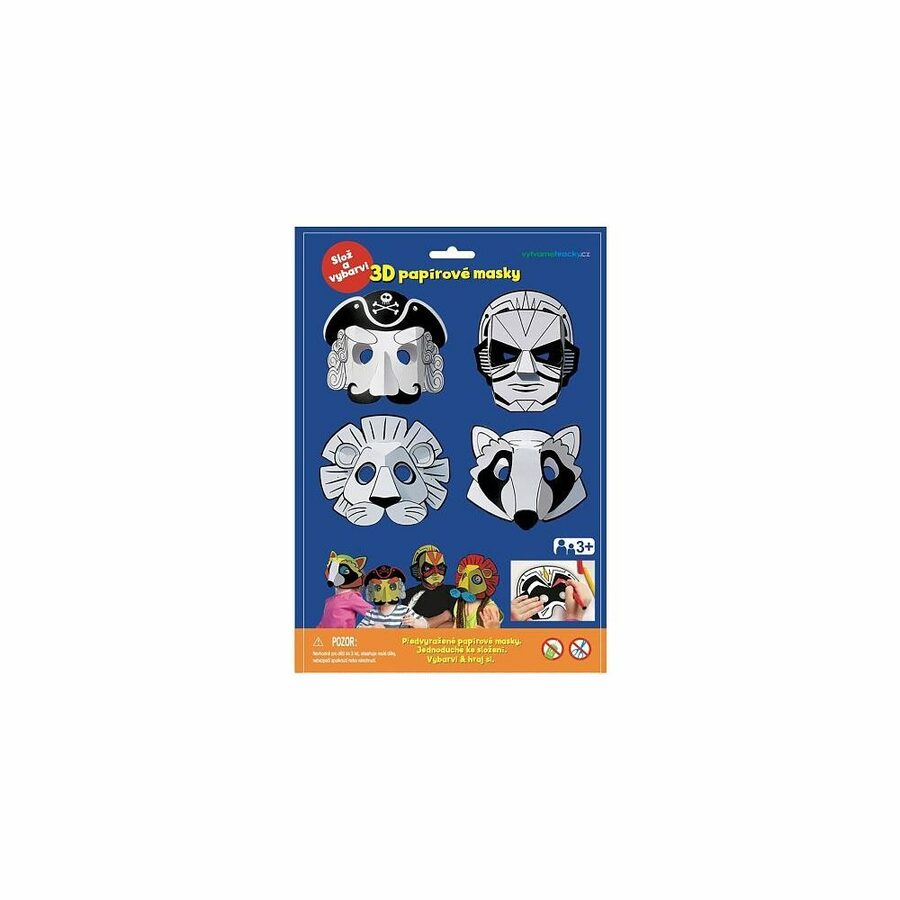 Papírové karnevalové masky - 4 ks - pirát, superhrdina, lev, mýval. Předvyražené masky slož podle obrázkového návodu a vymaluj si. Sada obsahuje 4 různé masky, gumičku, obrázkový návod. Barvy nejsou součástí balení. Masky jsou vyrobeny na kvalitním tvrdém papíru.