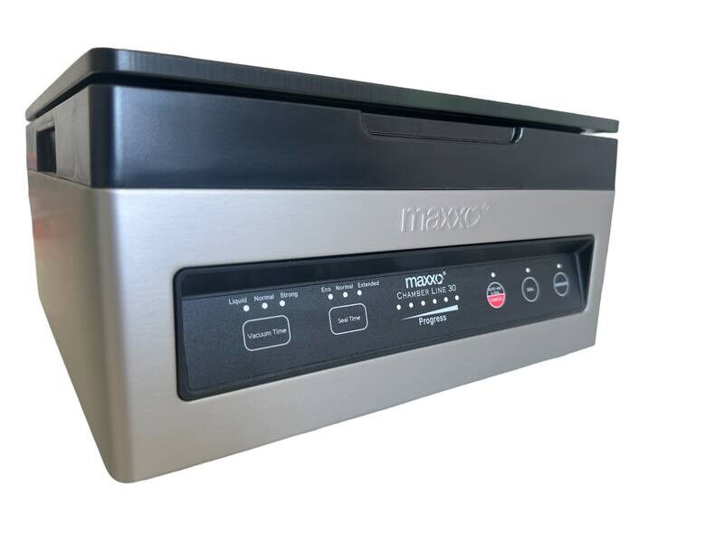 Svářečka fólií Maxxo Chamber Line 30 umožňuje snadné a rychlé vakuování nejen pevných a suchých, ale také vlhkých potravin – včetně tekutin, jako jsou polévky či omáčky. Nabízí automatické i manuální režimy vakuování, možnost pouze zatavení, přerušení odsávání a program pro marinování, který je ideální pro přípravu pokrmů metodou sous-vide. Vyniká extrémním sacím výkonem 40 l/min, který zajišťují čtyři výkonné pumpy. Doba odsávání a sváření je nastavitelná, dvojitý svár zajišťuje maximální bezpečnost.