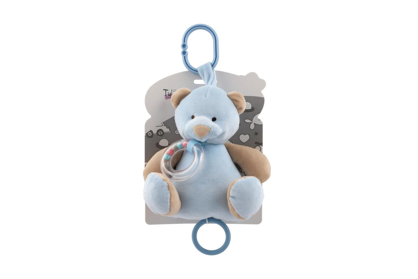 Medvěd plyš 18cm závěs na postýlku/kočárek nat. hrací strojek modrý na kartě v sáčku 0+