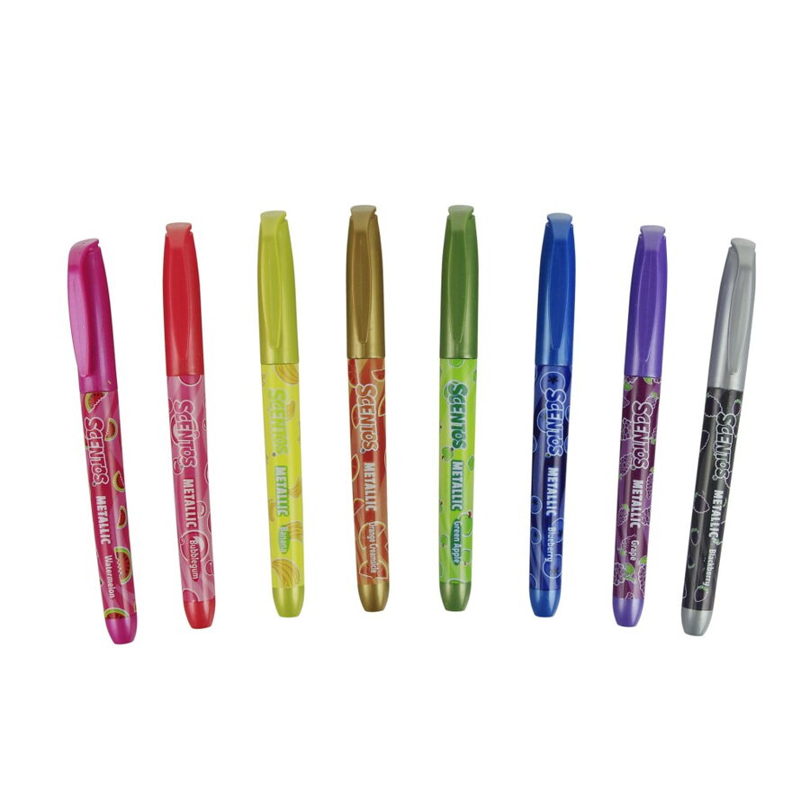 8 metalických fixů v různých barvách Každý fix s ovocnou vůní Lesklý efekt – skvěle vynikne na tmavém papíře