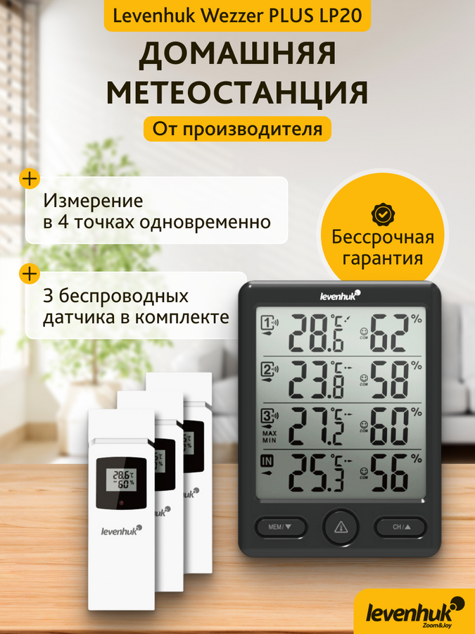 Meteorologická stanice Levenhuk Wezzer PLUS LP20 měří teplotu a vlhkost současně na čtyřech místech. Je to velmi praktický přístroj pro sledování změn počasí a mikroklimatu v několika místnostech, například v budovách na pozemku. Základna meteorologické stanice měří teplotu a vlhkost v místě instalace a lze ji namontovat na stěnu nebo umístit na rovný povrch. Tři bezdrátové senzory dálkového ovládání přenášejí údaje do základnové stanice prostřednictvím rádiového spojení. Senzory mohou být namontovány na stěnách až do vzdálenosti 100 m od základnové stanice.