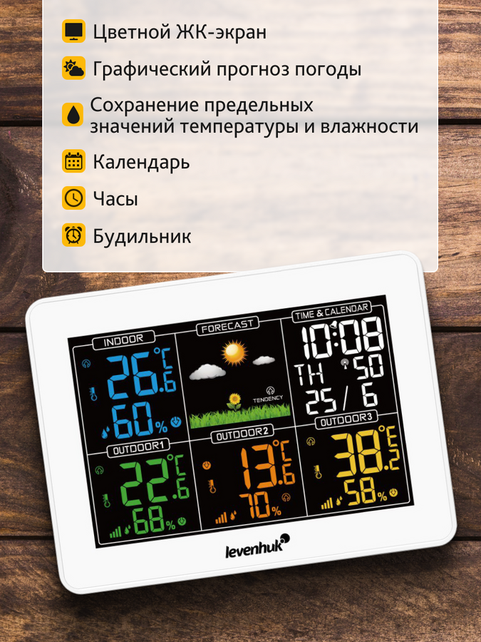 Meteorologická stanice Levenhuk Wezzer PLUS LP60 je kompaktní přístroj pro váš domov, kancelář nebo venkovský dům. K základnové stanici jsou připojeny tři senzory dálkového ovládání, díky kterým budete mít přehled o změnách počasí na čtyřech různých místech najednou. Meteorologická stanice vám pomůže udržet ideální mikroklima v obytných a firemních budovách a také vás bude informovat o blížícím se špatném počasí. Základnovou stanici lze umístit na stůl nebo okenní parapet; senzory mají nástěnné držáky.