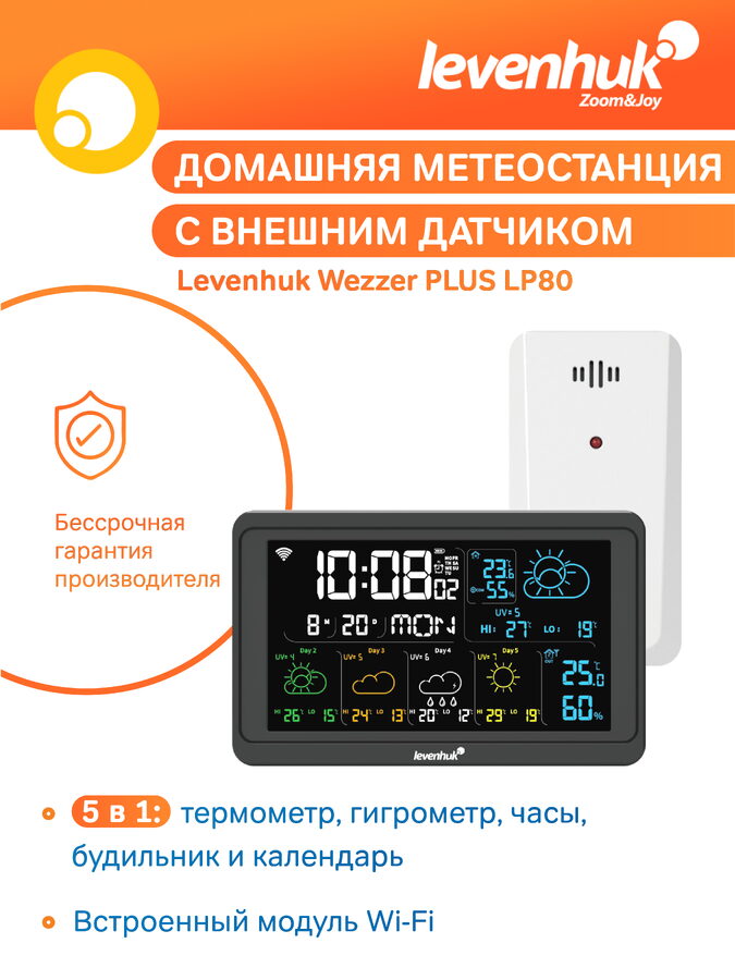 Levenhuk Wezzer PLUS LP80 je domácí meteorologická stanice, kterou lze ovládat z mobilní aplikace na smartphonu nebo tabletu prostřednictvím Wi-Fi a Bluetooth. Stanice je vybavena bezdrátovým senzorem dálkového ovládání, který umožňuje sledovat změny v mikroklimatu uvnitř i venku. Základnovou stanici lze umístit na noční stolek nebo okenní parapet a senzor lze zavěsit na stěnu ve vzdálenosti až 100 m.