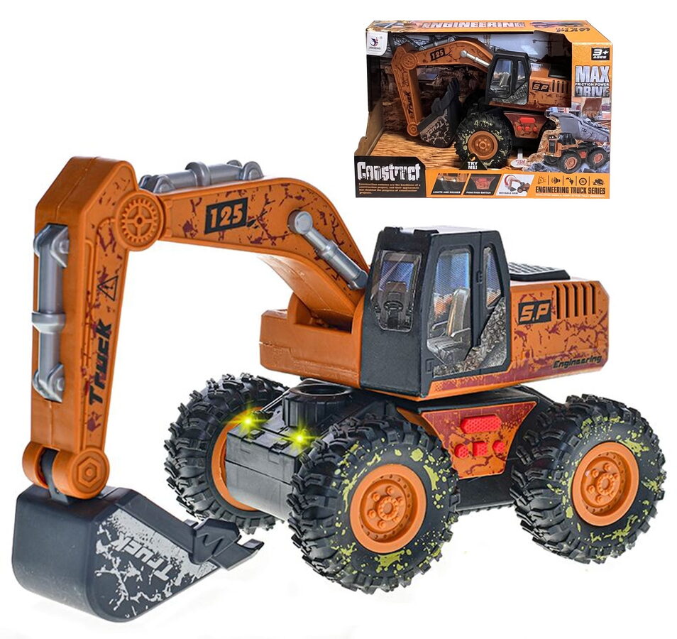 (BAL:1/24ks) Bagr stavební Construct 25cm plast se světlem a zvukem na setrvačník. Pohyb: na setrvačník. Design: stavební stroj - bagr.Svítí a vydává čtyři různé zvuky.Napájení: na baterie 3 x AG13/LR44 (součástí balení). Materiál: plast. Barva: oranžová. Rozměr: 25 x 13 x 14 cm. Vhodné pro děti od 3 let. Balení: papírová krabička s průhledem.