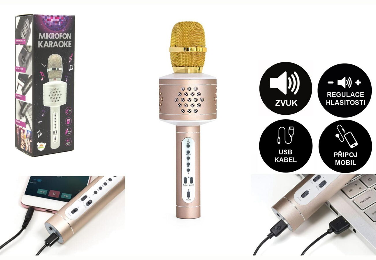 Mikrofon karaoke Bluetooth zlatý na baterie s USB kabelem v krabici 10x28x8,5cm