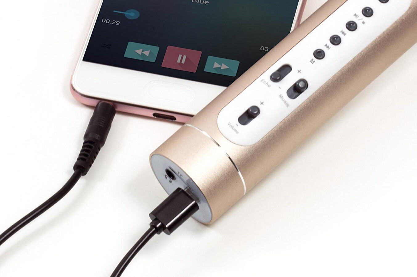 Bezdrátový karaoke mikrofon nesmí chybět na žádné párty. Pomocí kabelu nebo Bluetooth propojíte svůj telefon s mikrofonem. AUX konektor pro přehrávání hudby z mobilního telefonu, PC, tabletu nebo MP3/MP4 přehrávače. Obsahuje slot pro TF card - zapněte mikrofon delším stiskem tlačítka ON, vložte paměťovou kartu a mikrofon začne přehrávat hudbu uloženou na kartě. Můžete začít zpívat společeně s mikrofonem. AUX konektor - zapojte kabel s koncovkou do AUX slotu a druhou koncovku USB do mobilu, tabletu, PC nebo MP3. Mikrofon začne přehrávat hudbu, kterou si v připojeném zařízení vyberete a můžete začít zpívat. Při zapnutí mikrofonu Bluetooth pracuje spontánně. Pokud spojení nenaváže, hledá jiné BT spojení. Pokud mikrofon nemůžete spárovat, zkontrolujte, zda zařízení, se kterým chcete mikrofon spárovat podporuje A2DP. Možné nastavení hlasitosti a intenzity hudby a ozvěny.