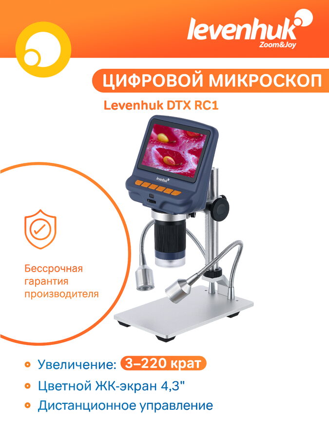 Dálkově ovládaný mikroskop Levenhuk DTX RC1 je ideální pro detailní práci se šperky, elektronikou, hodinovými strojky a dalšími drobnými předměty. Díky barevné 4,3" LCD obrazovce, pokročilému LED osvětlení a možnosti ovládání na dálku ho využijete nejen pro výzkum, ale i prezentace nebo výuku. Obraz pozorovaný v objektivu se zobrazí v reálném čase na LCD displeji. V případě potřeby ho navíc můžete sledovat na monitoru počítače, který k mikroskopu připojíte USB kabelem. Velkou výhodou je navíc dálkové ovládání. Kabelové dálkové ovládání použijete k nastavení osvětlení, zatímco bezdrátově na dálku ovládáte zvětšení, pořizovaná snímků a zachycení videí.