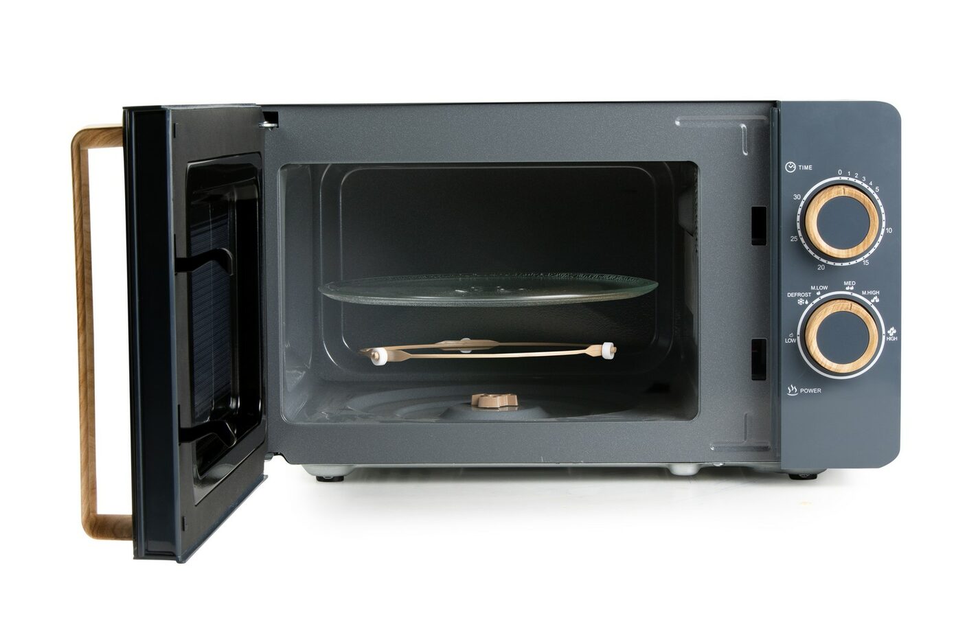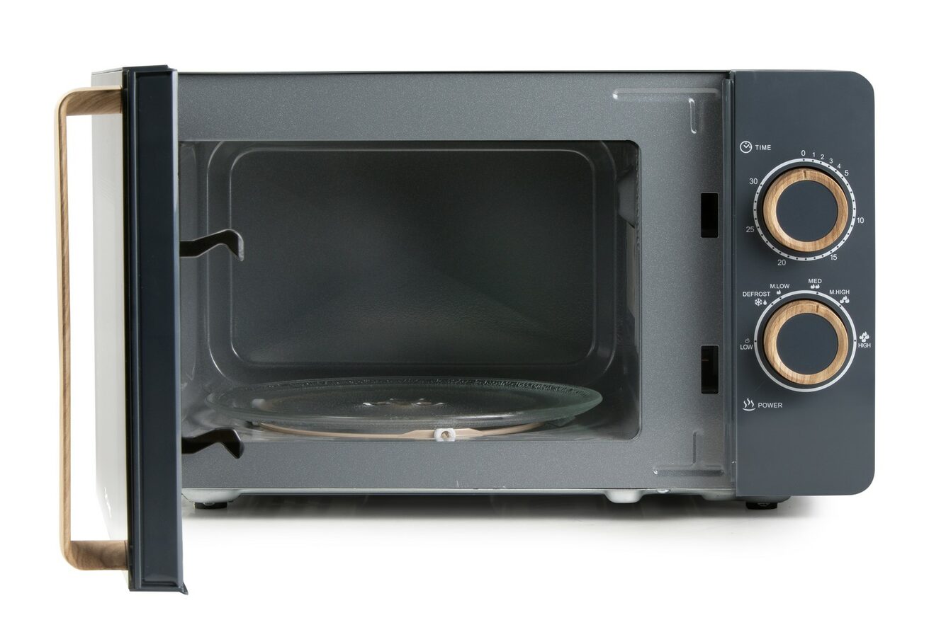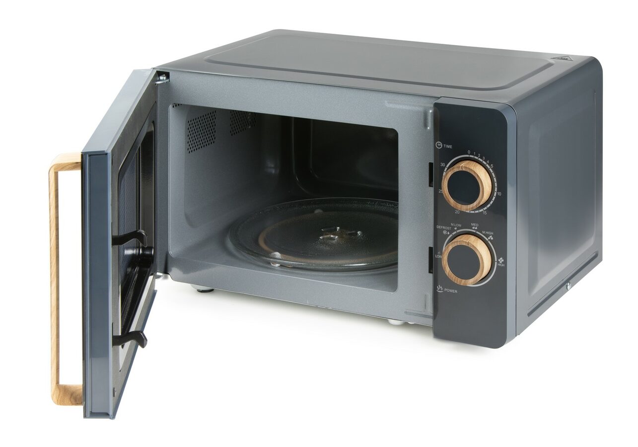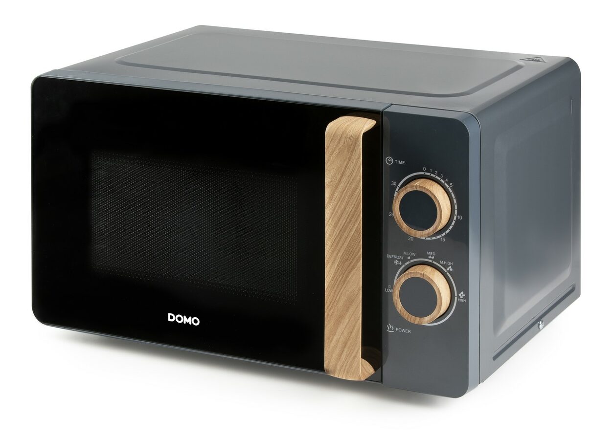 Funkce rozmrazování zajišťuje rychlé rozmrazování mražených potravin. Tato samostatná mikrovlnná trouba má skleněný otočný talíř o průměru 24,5 cm a dává konečný signál, když je vaše jídlo hotové. Šedé provedení s povrchovou úpravou ve vzhledu dřeva dodá vaší kuchyni moderní šmrnc.