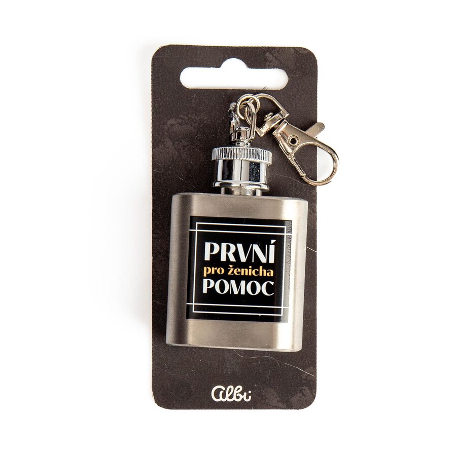 Mini placatka s nápisem "První pomoc pro ženicha" má objem 30 ml.