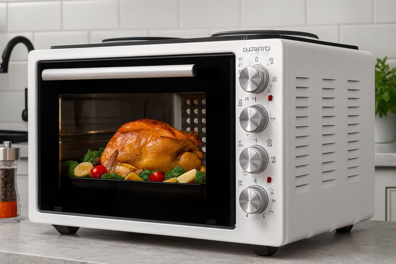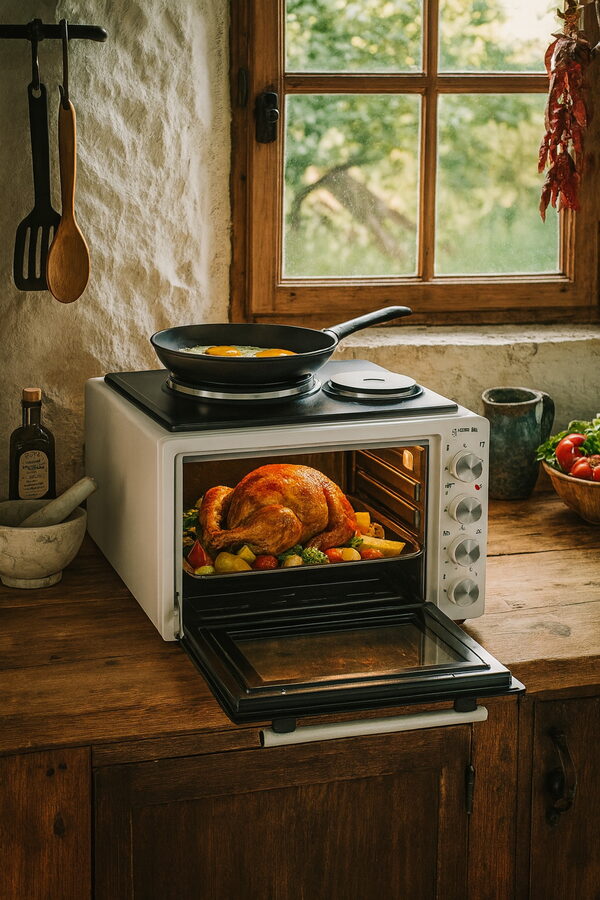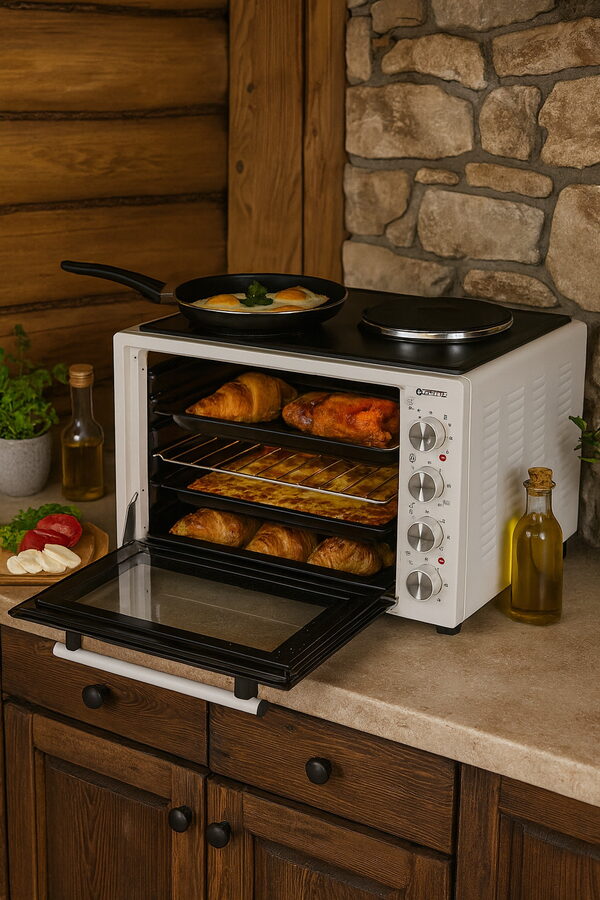 Typ: Elektrická pečící trouba s dvěma plotýnkami pro vaření a pečení v jednom spotřebiči.
