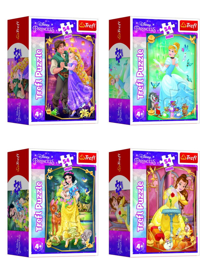 Minipuzzle Krásné princezny/Disney Princess 54dílků 4 druhy v krabičce 6x9x4cm 40ks v boxu
