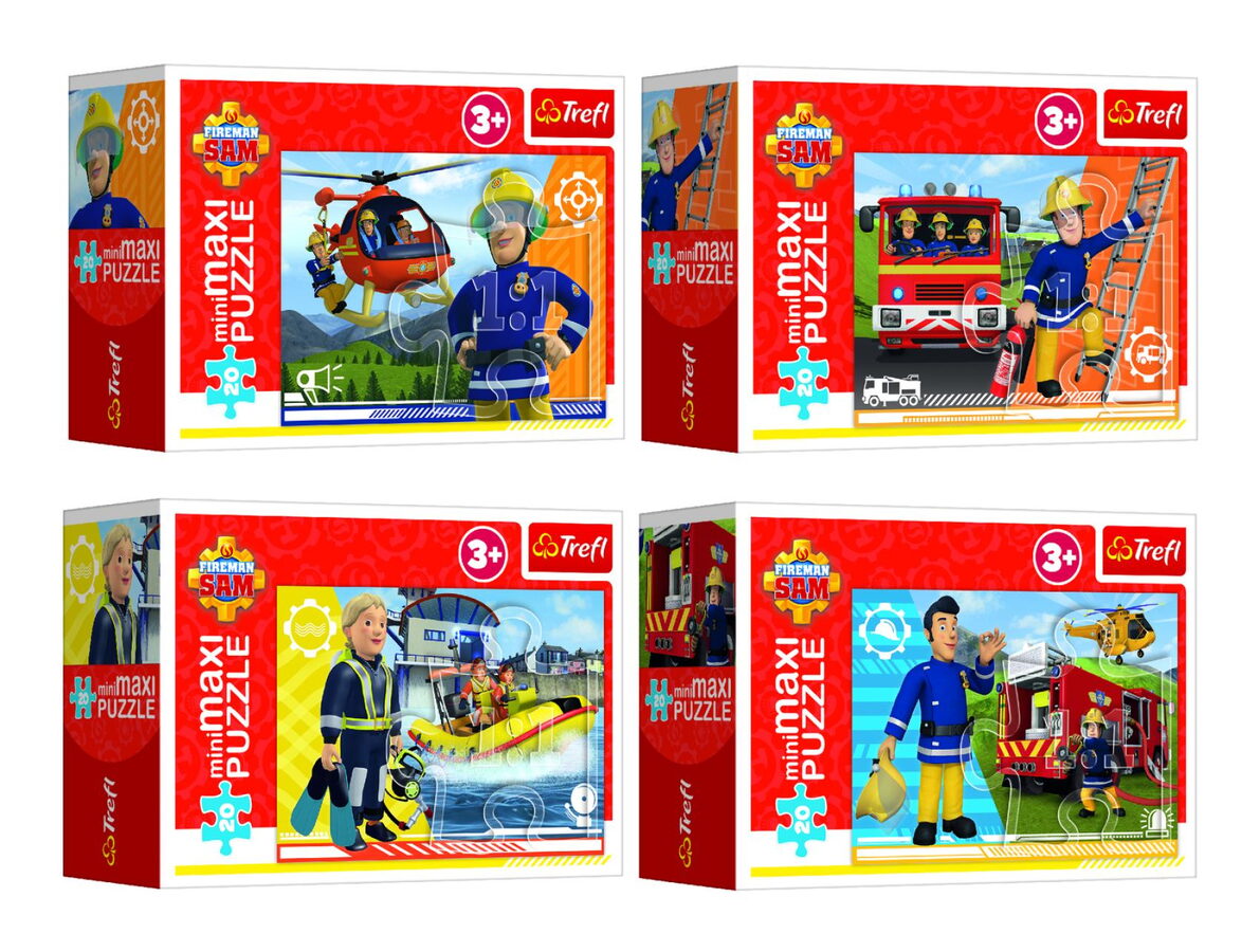 Minipuzzle miniMAXI 20 dílků Hrdinský Požárnik Sam 4 druhy v krabičce 11x8x4cm 24ks v boxu