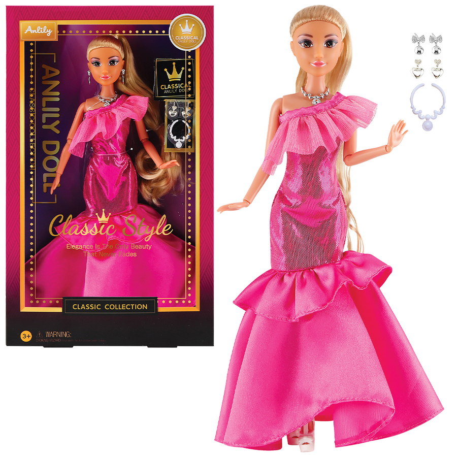 Módní panenka ve společenských šatech - tmavě růžové šaty