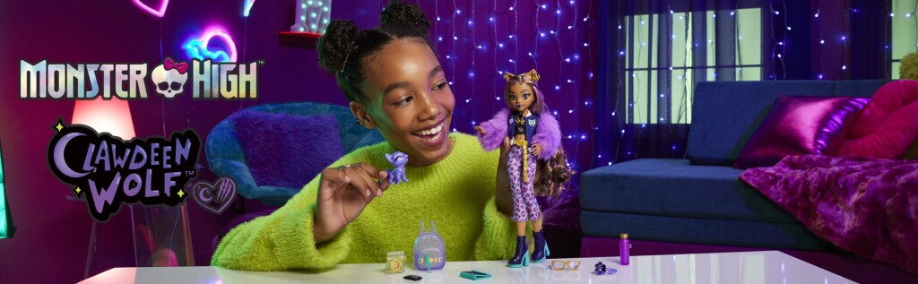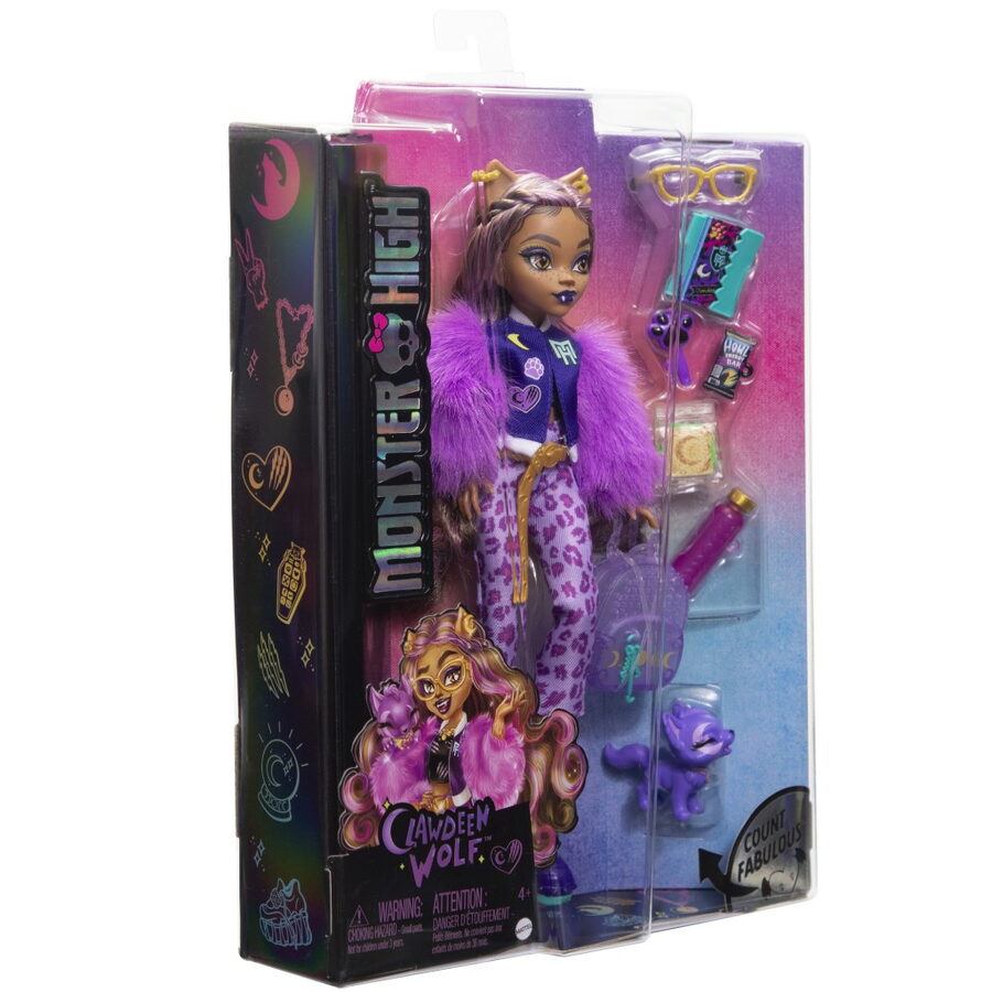 Příšerka monsterka Clawdeen Wolf™ Monster High™ je ve svém rozkošném fialovém provedení od hlavy až k patě stylovou vlkodlačí panenkou. Je dodávána se svým mazlíčkem Crescent™ v podobě kočky a 6 doplňky pro vyprávění příběhů, jako jsou například batoh, kniha a svačinka!