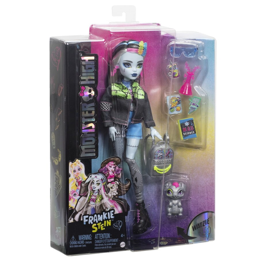 Příšerka monsterka Frankie™ z Monster High™ je ve svém elektrizujícím džínovém oblečku ikona strašidelného módního stylu! Psí mazlíček Watzie™ stojí jako vždy věrně po jejím boku. Panenka Frankie Stein™ s kloubovým tělem a jedinečnými doplňky pro vyprávění příběhů je skvělým dárkem pro děti od 4 let. Panenka nemůže stát sama. Barvy a dekorace se mohou lišit.