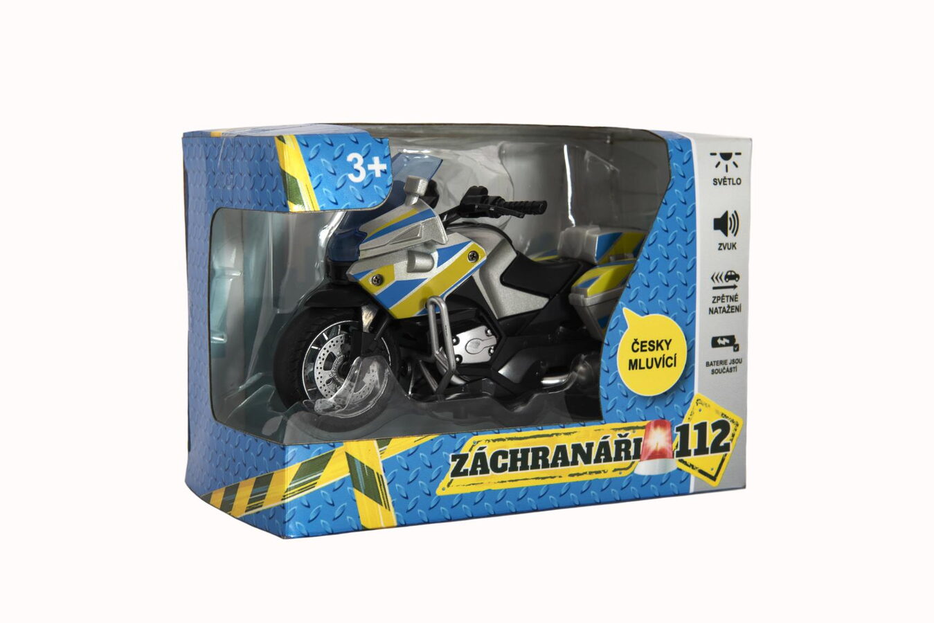 Chceš si zahrát na dopravního policistu? Tento plastový model motorky s kovovými díly je k tomu jako stvořený. Po zpětném natažení se motorka rozjede a po mačkání zadního kola začne svítit, houkat a mluvit česky. Baterie 3x LR41 jsou součástí balení.
