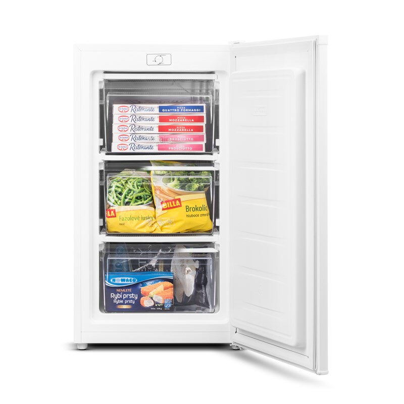 Šuplíková mraznička, užitný objem 60 l, mrazicí kapacita 2,8 kg za 24 hod., spotřeba 156 kWh/rok, energetická třída E.