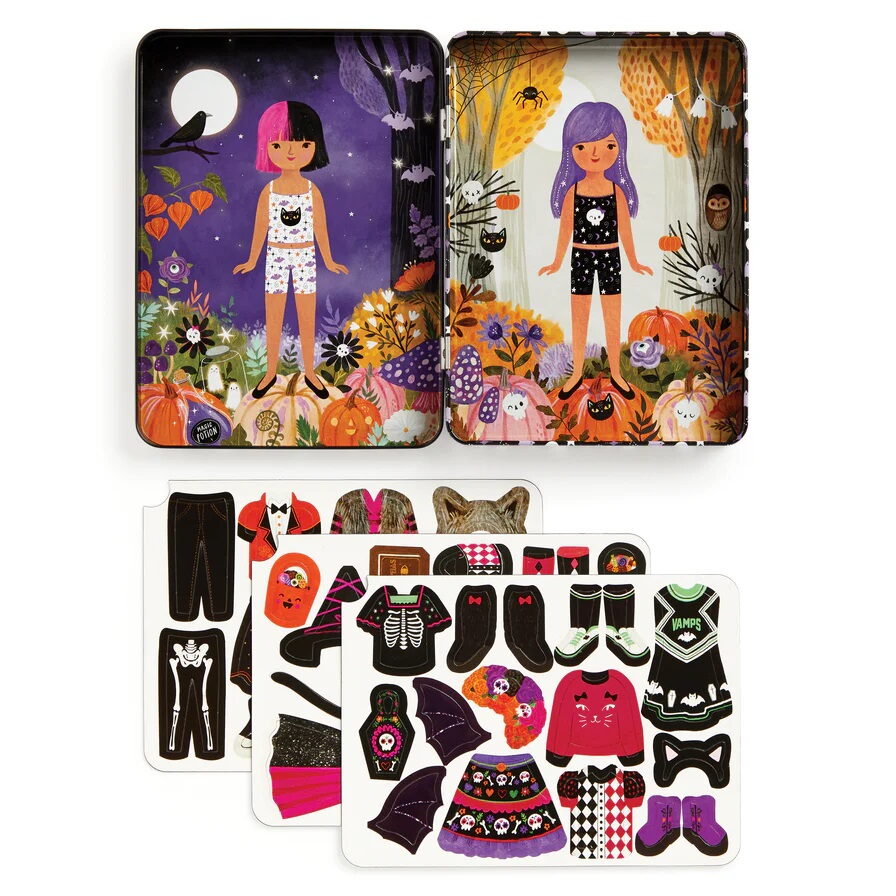 Ponořte se do světa módy s touto magnetickou sadou, která byla navržená k tomu, aby inspirovala děti ke kreativitě. Prozkoumejte svůj smysl pro styl a představivost a nakombinujte halloweenské kostýmy dle své vlastní fantazie. Hra obsahuje 2 ilustrované scény na pozadí, v každé části je jedna slečna, která čeká na své strašidelné oblečení. K dispozici je na 3 kartách více než 45 magnetů s tematickým oblečením a doplňky. Kombinujte vše dle svých vlastních představ. Vhodné na doma i na cesty. Hlavní vlastnosti: praktická kovová krabičkavíce než 45 magnetů na 3 kartách2 ilustrované scény pozadí se 2 postavamisada vhodná pro hru na cestách