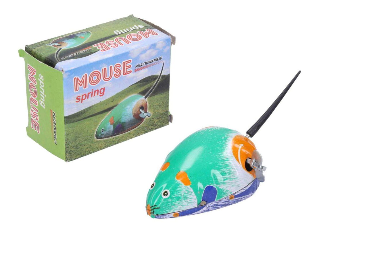 Pohyb plechové myšky zajišťuje pérový strojek natahovaný klíčkem.