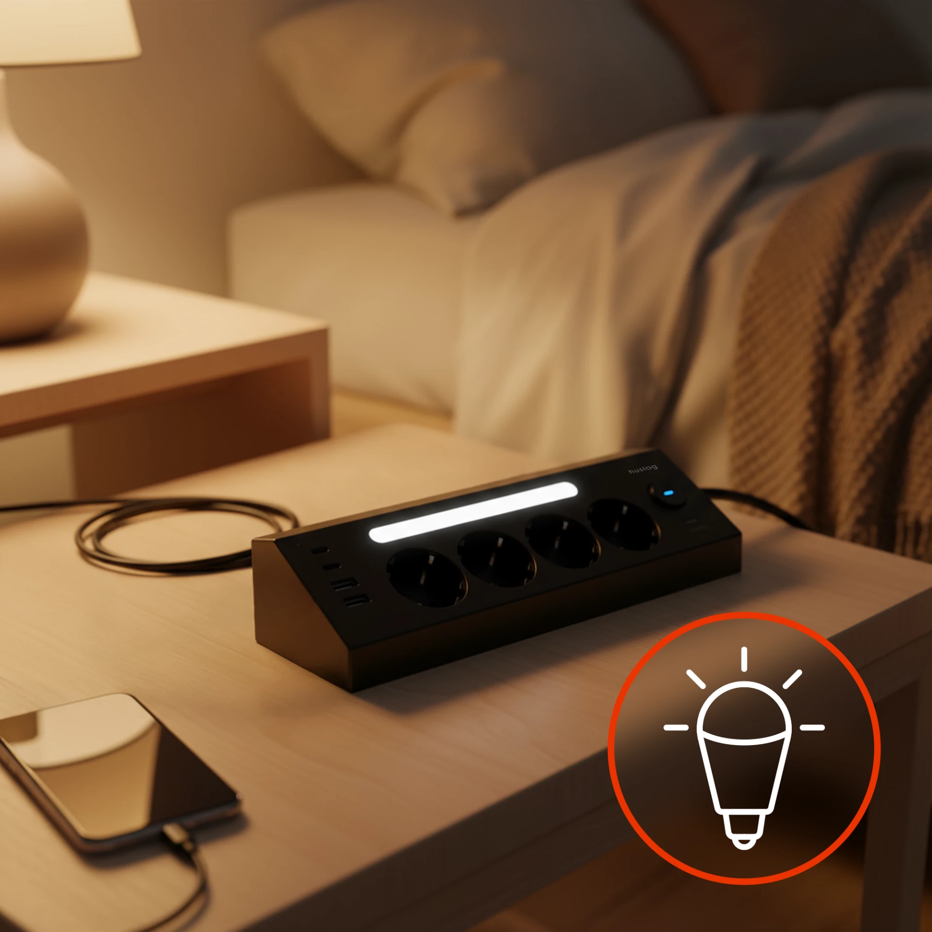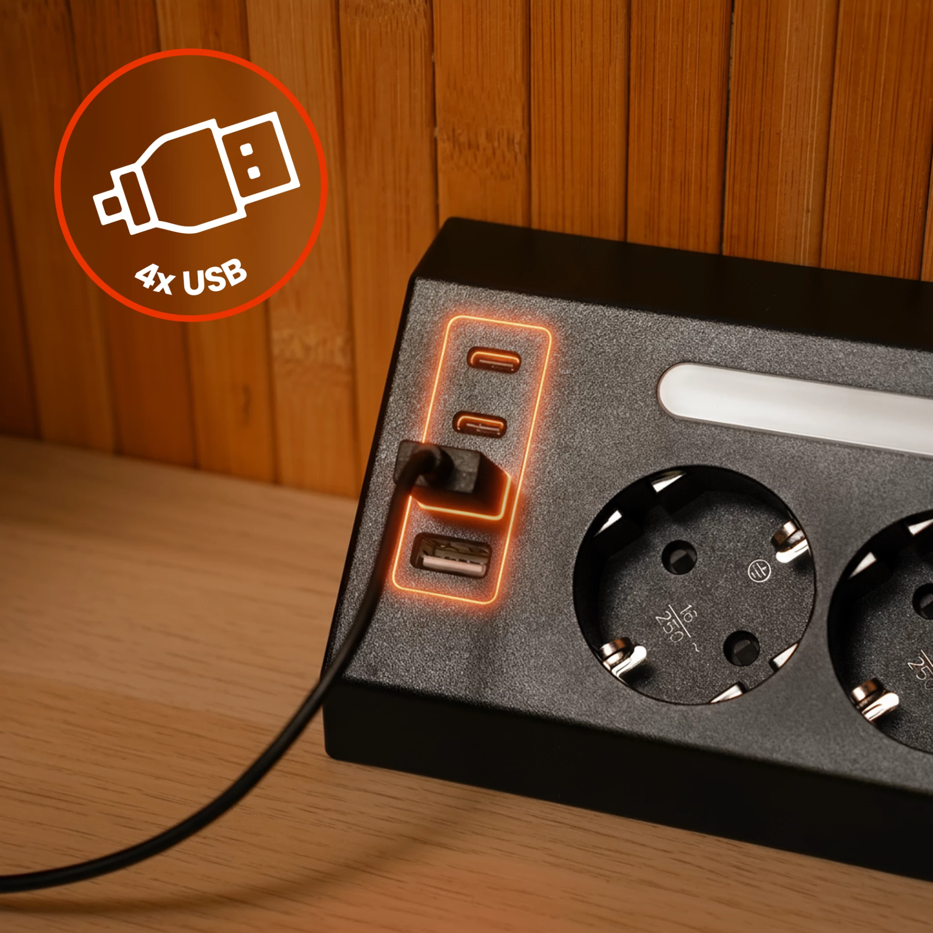 4 USB portyDíky 2 portům USB-A (2,4 A) a 2 portům USB-C (3 A) můžete nabíjet až 4 zařízení současně. Smartphony, tablety a příslušenství jsou vždy připraveny k použití, aniž byste museli používat další nabíječky. To vám ušetří místo a přinese pohodlí doma i v kanceláři. |