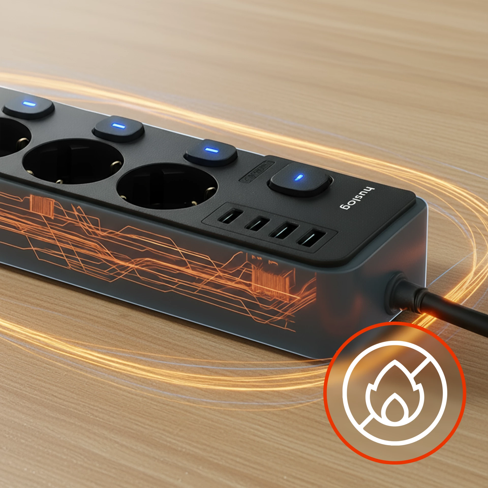 Nehořlavý krytKryt vyrobený z nehořlavého plastu a použití měděných vodičů zaručují vysokou úroveň bezpečnosti. I při intenzivním používání si lišta zachovává odolnost vůči teplotám a poškození. To znamená dlouhou životnost a jistotu ochrany vašich zařízení. |