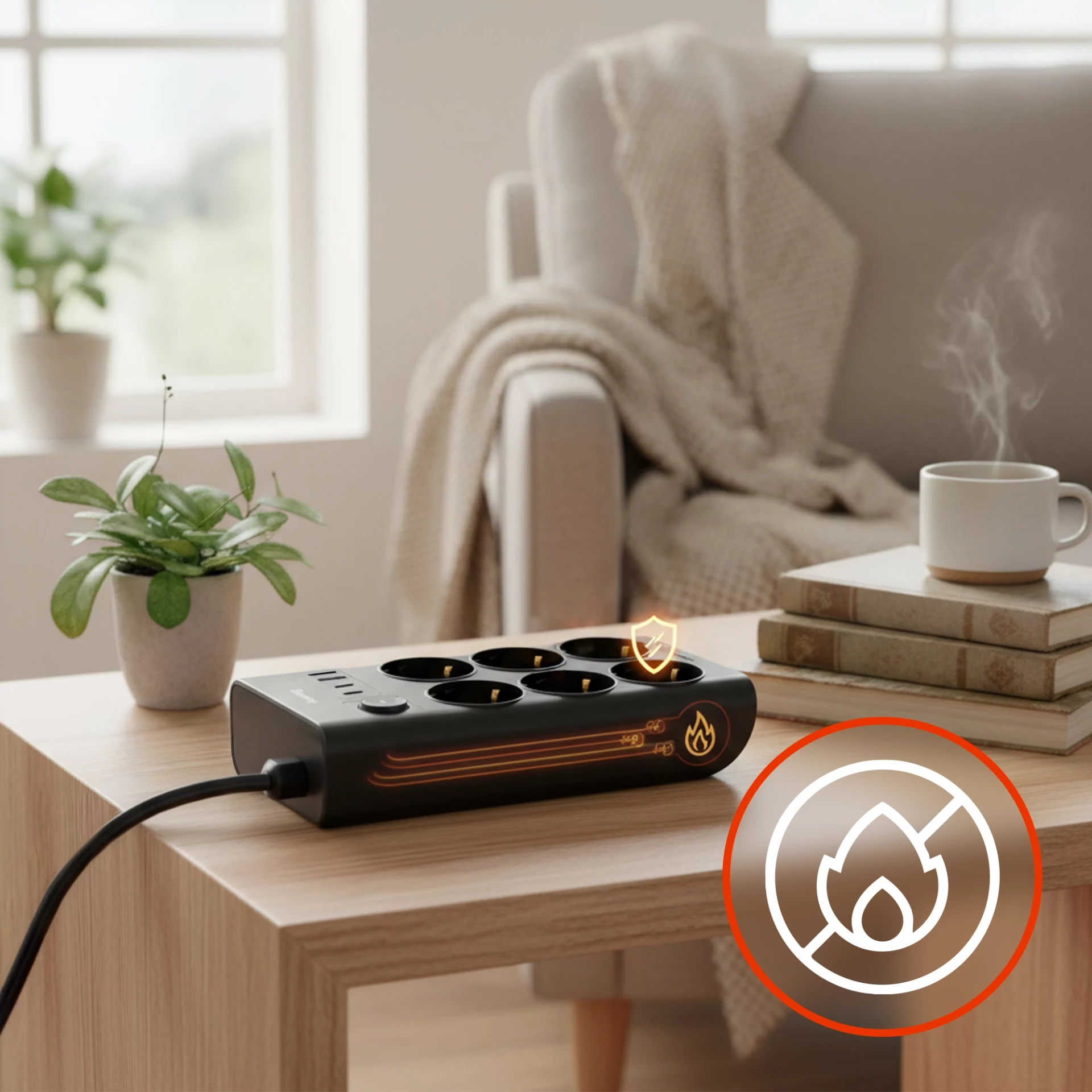 Nehořlavý krytKryt vyrobený z nehořlavého polypropylenu (PP) a měděné vodiče zaručují bezpečnost i při intenzivním používání. Tyto materiály jsou odolné vůči vysokým teplotám, což minimalizuje riziko přehřátí. Díky tomu získáte klid a jistotu, že vaše zařízení jsou dobře zabezpečena. |