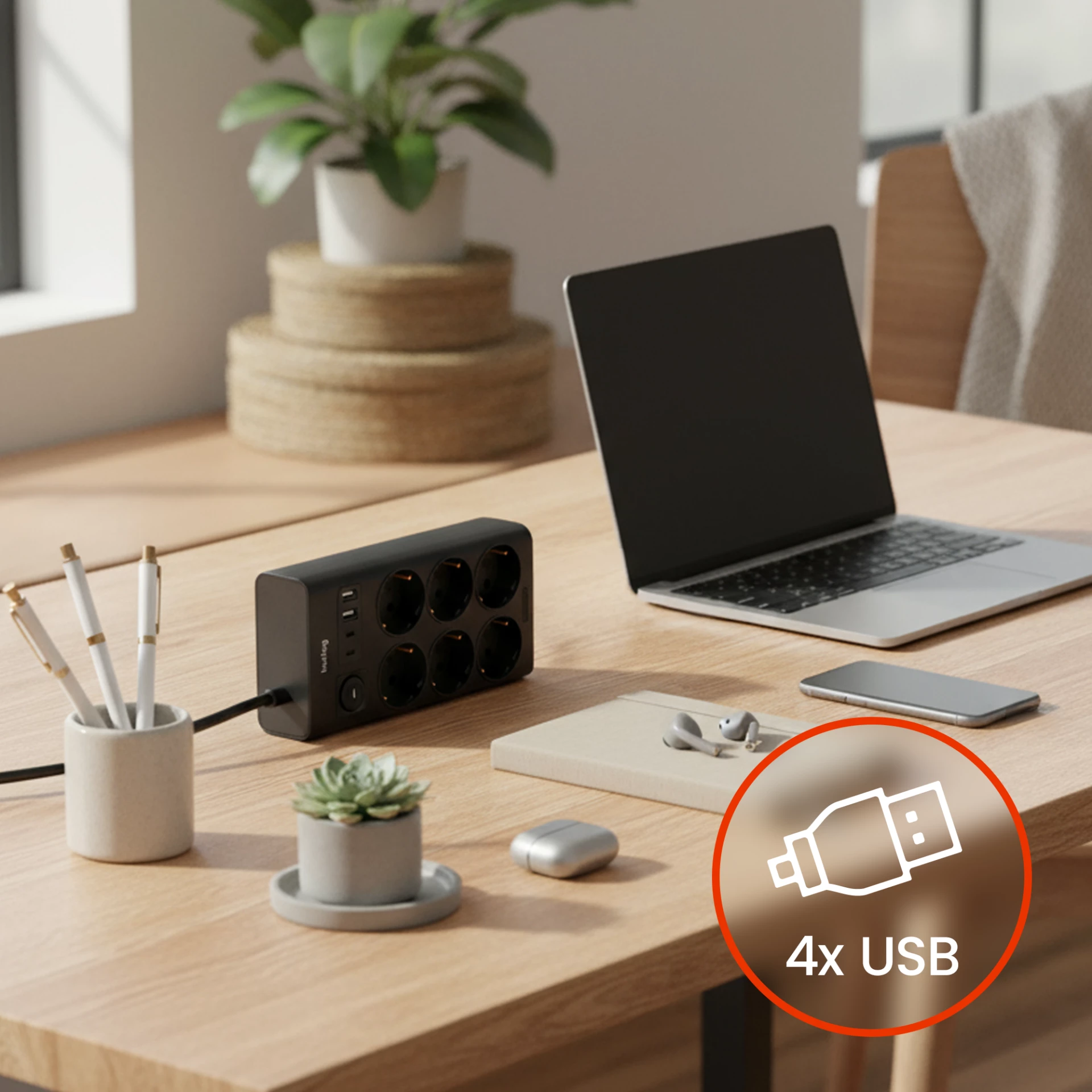 4 USB portyDíky 2 portům USB-A (2,4 A) a 2 portům USB-C (3 A) umožňuje tato lišta rychlé a současné nabíjení až 4 mobilních zařízení. To znamená, že nemusíte používat další nabíječky, což šetří místo a udržuje pořádek. Je to ideální řešení pro rodiny, které mají více smartphonů, tabletů nebo powerbank. |