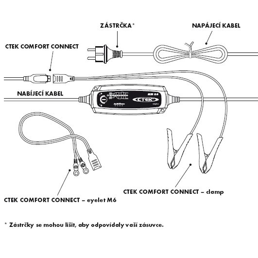 Nabíječka se dodává se dvěma sadami konektorů (krokosvorky, oka)