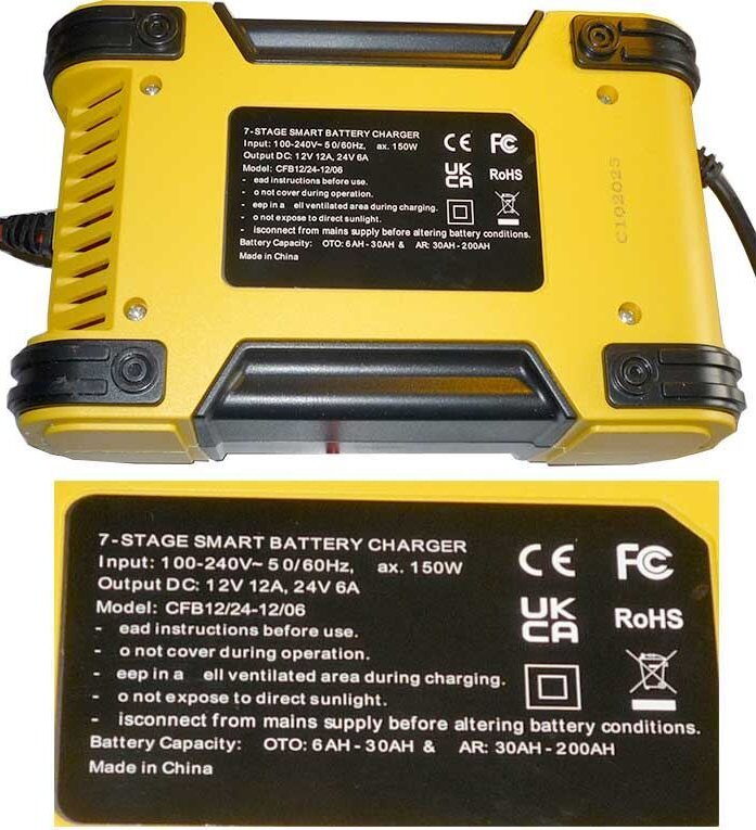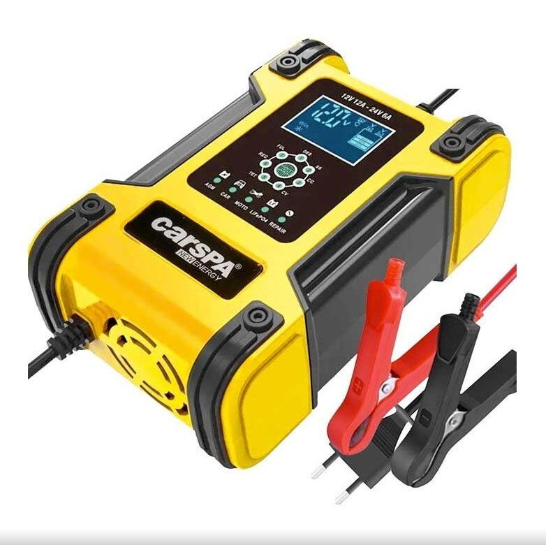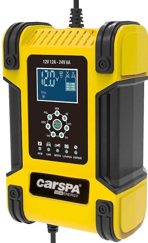 Chytrá nabíječka Carspa CFB12/24-12/06 nabíjí Pb i LiFePO4 baterie proudem až 12 A a umožňuje trvalé připojení k baterii bez rizika poškození. Využívá 7stupňový režim nabíjení a je vybavená také speciálním programem pro regeneraci olověných baterií.