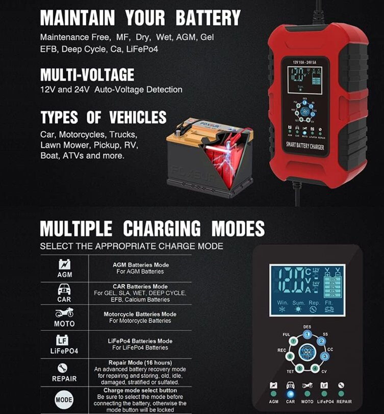 - Režimy nabíjení: AGM, CAR, MOTO, LiFePO4, REPAIR