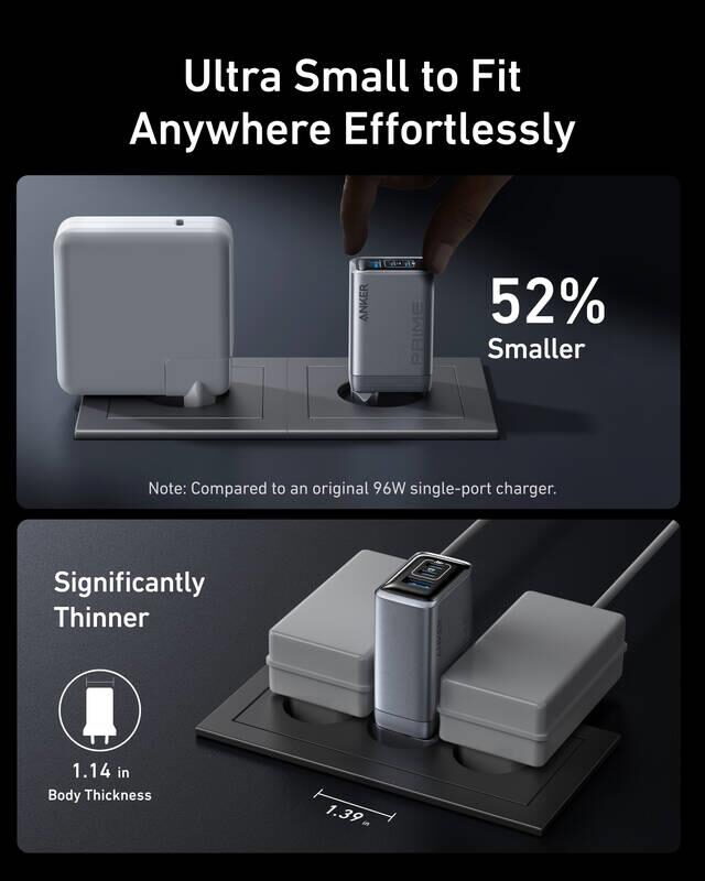 100W rychlonabíječka pro více zařízení: Napájejte tři zařízení současně s celkovým výkonem 100 W prostřednictvím dvou portů USB-C a jednoho USB-A pro efektivní distribuci energie.