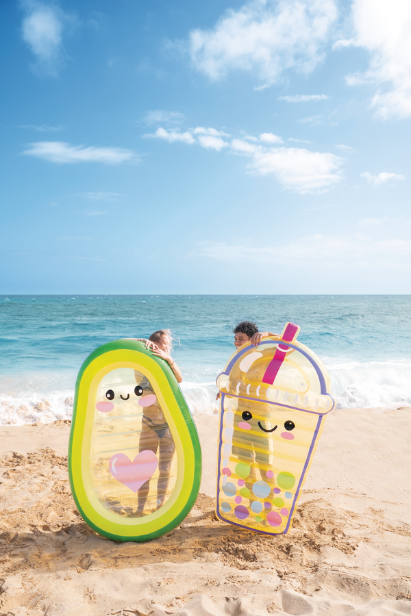 Nafukovací lehátko ve tvaru bubble tea Boba Buddy v barevném transparentním provedení.