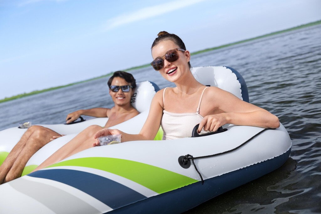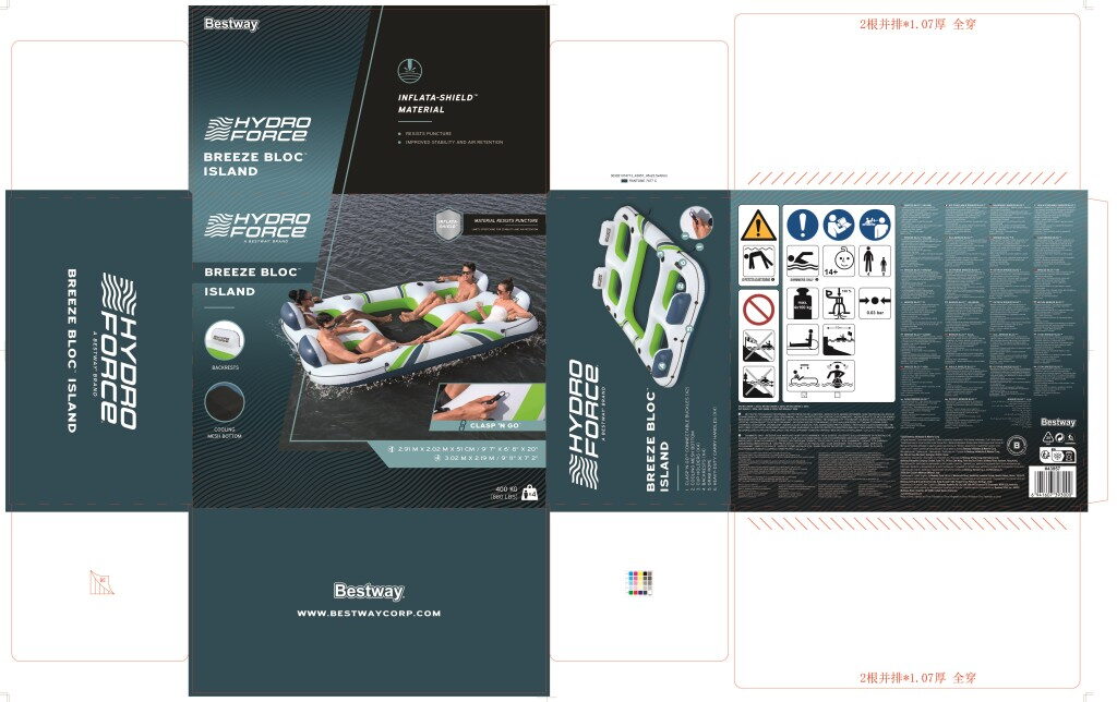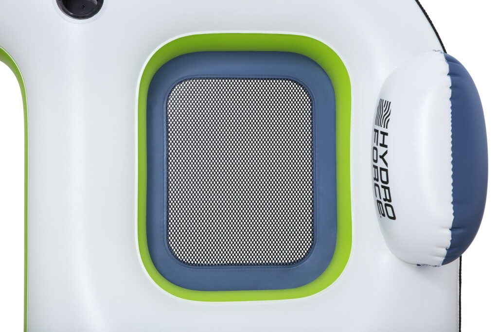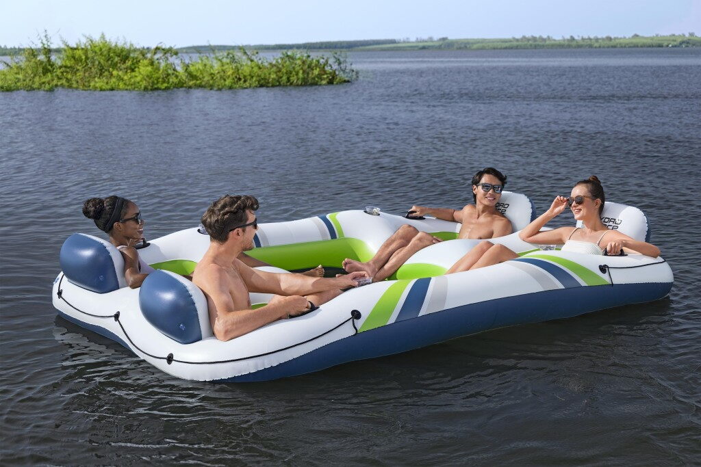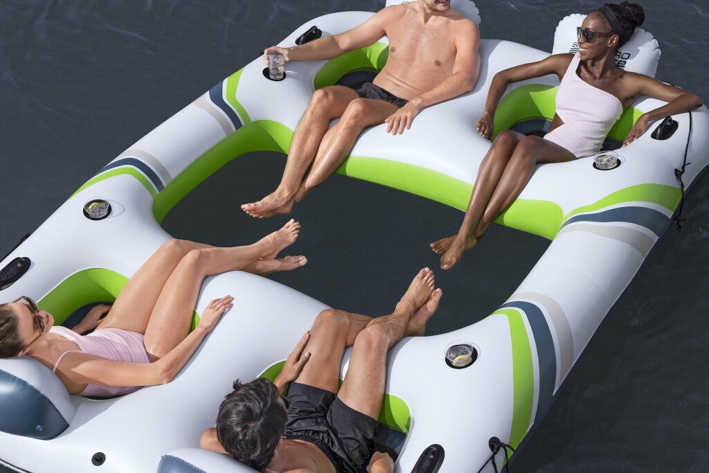 Nafukovací ostrov je z materiálu Inflata-Shield™, který je odolný proti propíchnutí a má zvýšenou pevnost, která zajišťuje lepší stabilitu a zadržování vzduchu. 2 spojky Clasp 'N Go™ umožňují spojit více ostrovů dohromady nebo připojit ostrov k jiným plovákům. Prémiová konstrukce se 4 opěradly. Ostrov má sedátka ze síťoviny, které příjemně chladí v horkých dnech na vodě, ve středu ostrova je otevřený prostor pro ponoření nohou do vody a má 4 držáky pro nápoje. Částečná madla usnadňují držení a vstupování na ostrov. Odolná madla pro přenášení. Rychloupínací ventily. Maximální nosnost je 400 kg.