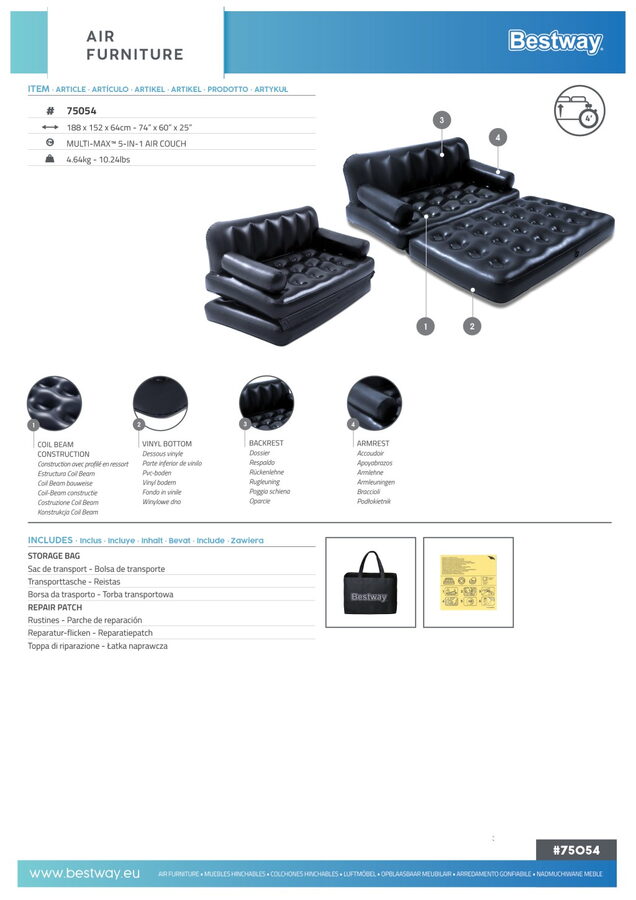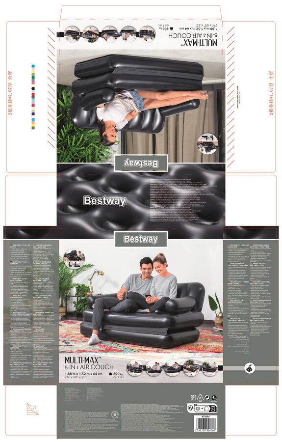 Nafukovací pohovka poslouží jako postel, relaxační pohovka, luxusní sofa, pohodlné lůžko nebo vyvýšené lůžko. Lůžka jsou pohodlná se tříkomorovým systémem a stabilní konstrukcí, vhodná pro každou příležitost. Během několika vteřin vytvoříte řadu užitečných kusů nábytku. 5 využitelných poloh dle vaší okamžité potřeby: