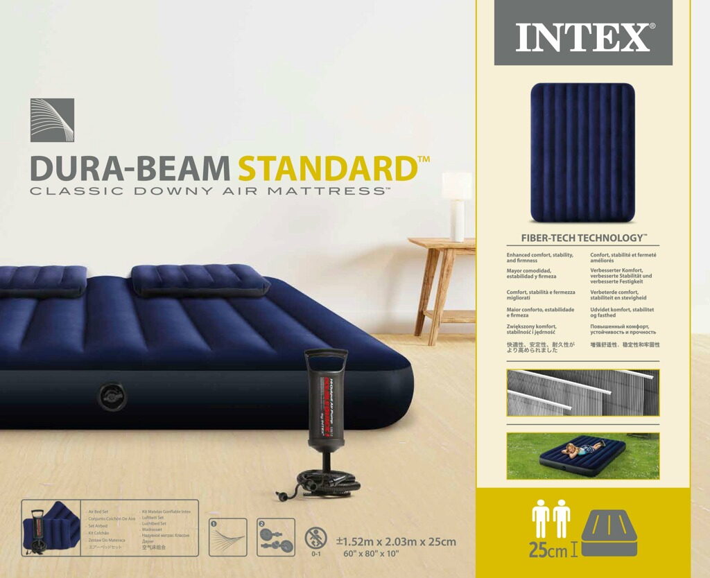 Základní rozměr: 152cm x 203cm x 25 cm. Součástí balení jsou dva polštáře o velikosti 43×28×9 cm a ruční pumpa. Ruční pumpa Velikost 29 cm. Dvojitý objem, dvojitý záběr Pumpuje vzduch při tahu vzhůru i při pohybu dolů. Flexibilní hadička se 3 násadami je použitelná pro většinu ventilků. Z lehkého pevného plastu.