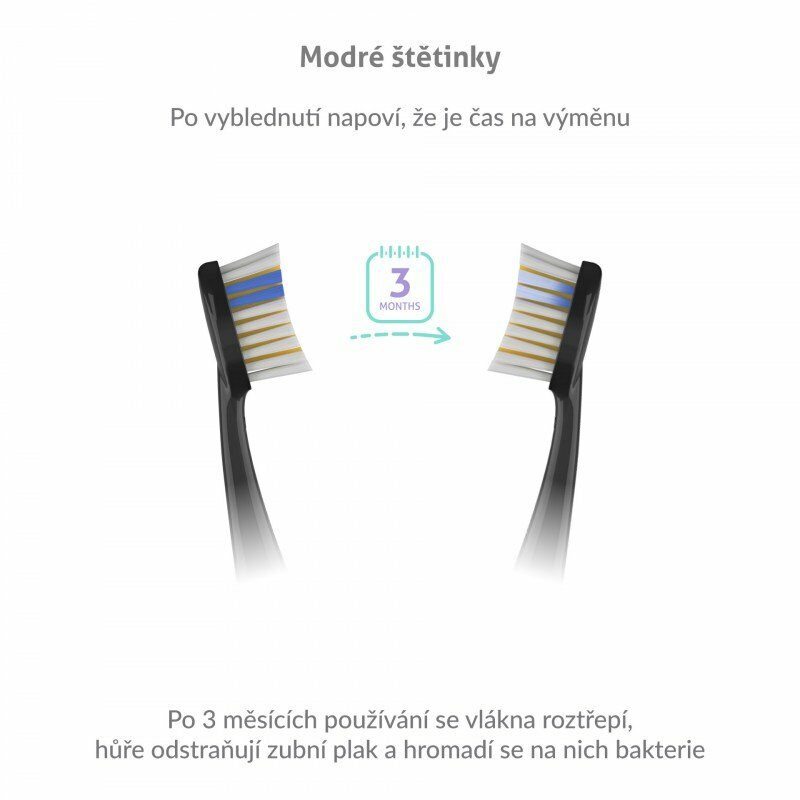 Sonický zubní kartáček se postará o maximálně efektivní dentální hygienu a zanechá vaše zuby jedinečně čisté během několika minut. Manuální kartáčky předčí především v preciznějším odstraňování zubního plaku a čištění mezizubních prostor. Náhradní hlavice jsou speciálně vyvinuty pro citlivé zuby. Nezapomeňte však vyměňovat každé 3 měsíce hlavice sonického kartáčku. Hlavice jsou vybaveny modrými štětinami, které po 3 měsících vyblednou a vy tak víte, že je čas hlavice vymněnit.