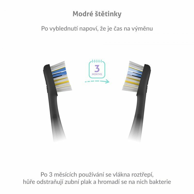 Sonický zubní kartáček se postará o maximálně efektivní dentální hygienu a zanechá vaše zuby jedinečně čisté během několika minut. Manuální kartáčky předčí především v preciznějším odstraňování zubního plaku a čištění mezizubních prostor. Náhradní hlavice jsou speciálně vyvinuty pro citlivé zuby. Guma ve tvaru X mezi štětinkami při čištění lehce klouže po zubech. Díky tomu lépe odstraní skvrny od čaje nebo kouře a krásně leští vaše zuby. Nezapomeňte však vyměňovat každé 3 měsíce hlavice sonického kartáčku. Hlavice jsou vybaveny modrými štětinami, které po 3 měsících vyblednou a vy tak víte, že je čas hlavice vymněnit.