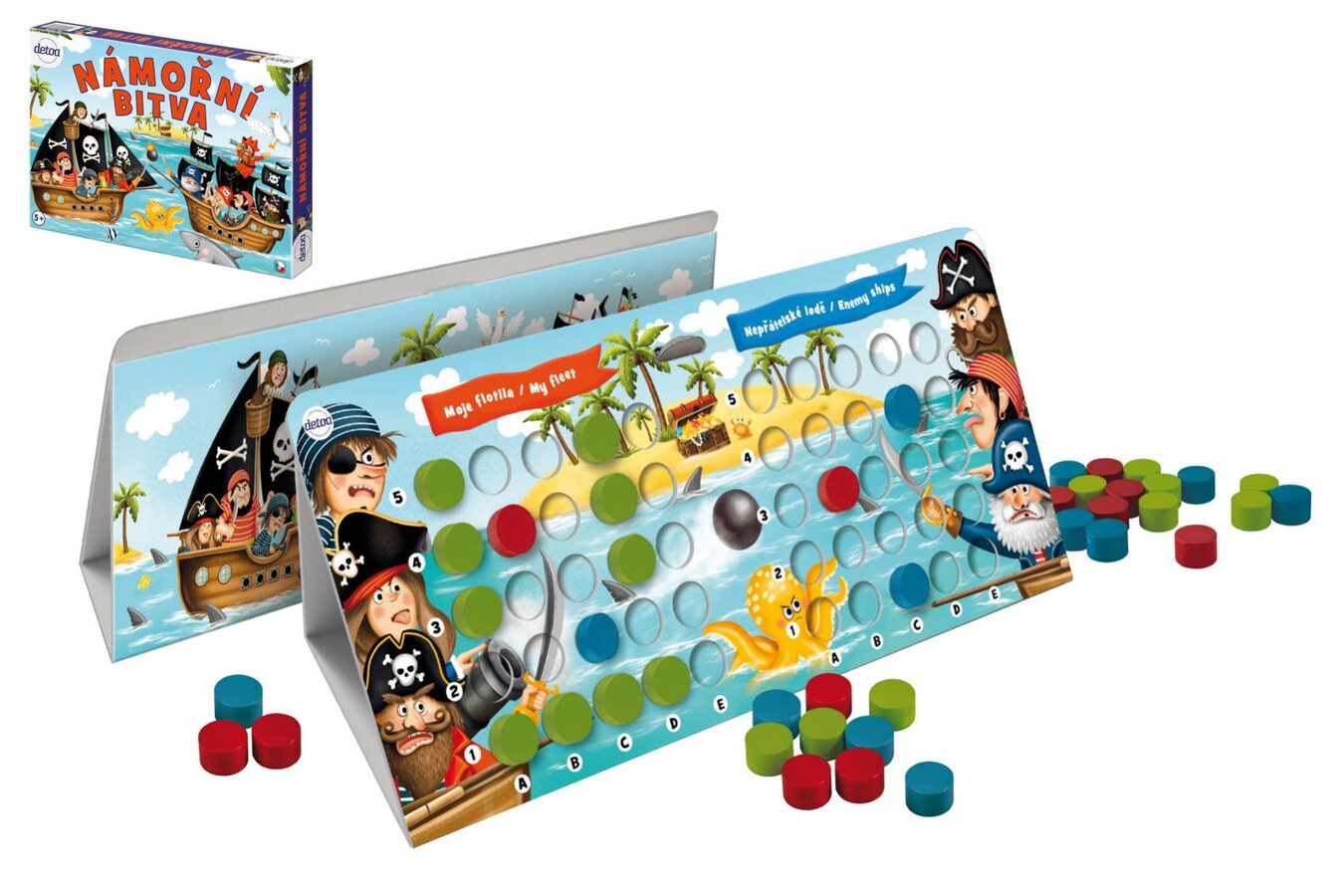 Námořní bitva je tradiční bojovou hrou pro děti i dospělé, obsahuje 2 kartonové, ilustrované stojany na dřevěné kameny (střely) a 144 ks kamenů.