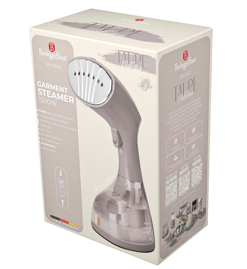 Parní napařovač oděvů představuje nejrychlejší a nejefektivnější způsob žehlení. Přístroj produkuje páru, která proniká látkou a šetrně tím prádlo žehlí. Nepotřebujete žehlící prkno a jednoduše vyžehlíte i oděvy na ramínkách. Napařovač oděvů BerlingerHaus využívá intenzivní sílu páry, oděvy nejen dokonale osvěží, ale také dezinfikuje a zbavuje virů a bakterií. Použití je velmi jednoduché a zvládne jej opravdu každý. Napařování přináší perfektní výsledky i v místech, kde to s klasickou žehličkou není zrovna jednoduché a to např. u límců nebo manžet. Napařovač je díky kompaktním rozměrům skladný a vždy připraven po ruce.