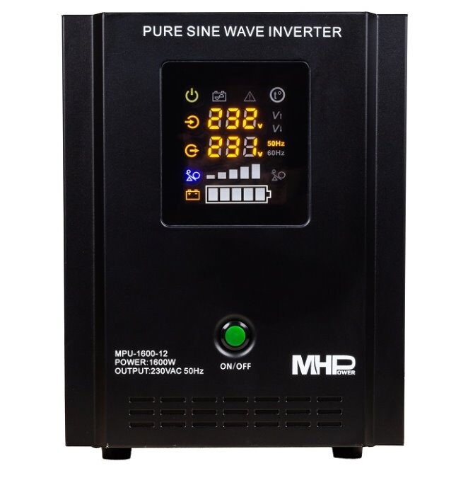 Záložní zdroj a napěťový měnič MPU-1600-12 značky MHPower je ideální pro dlouhodobé zálohování. Je ideálním přístrojem pro své flexibilní použití a robustní celokovové provedení. Přístroj má zabudovanou ochranu proti přetížení, a to jak při napájení z baterie, tak i ze sítě. Maximální trvalý výkon činí 1600 W.