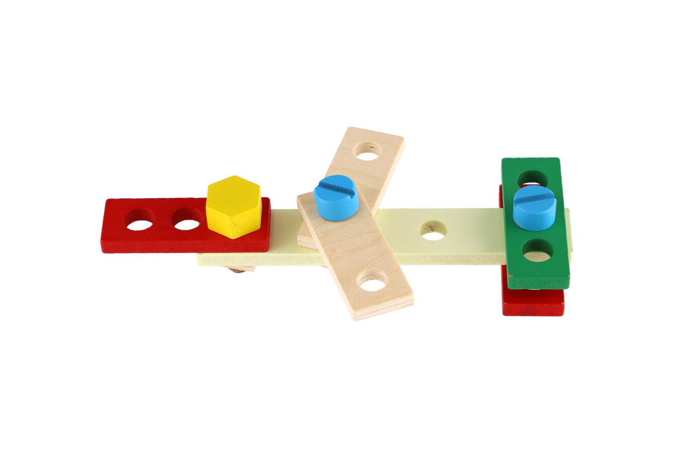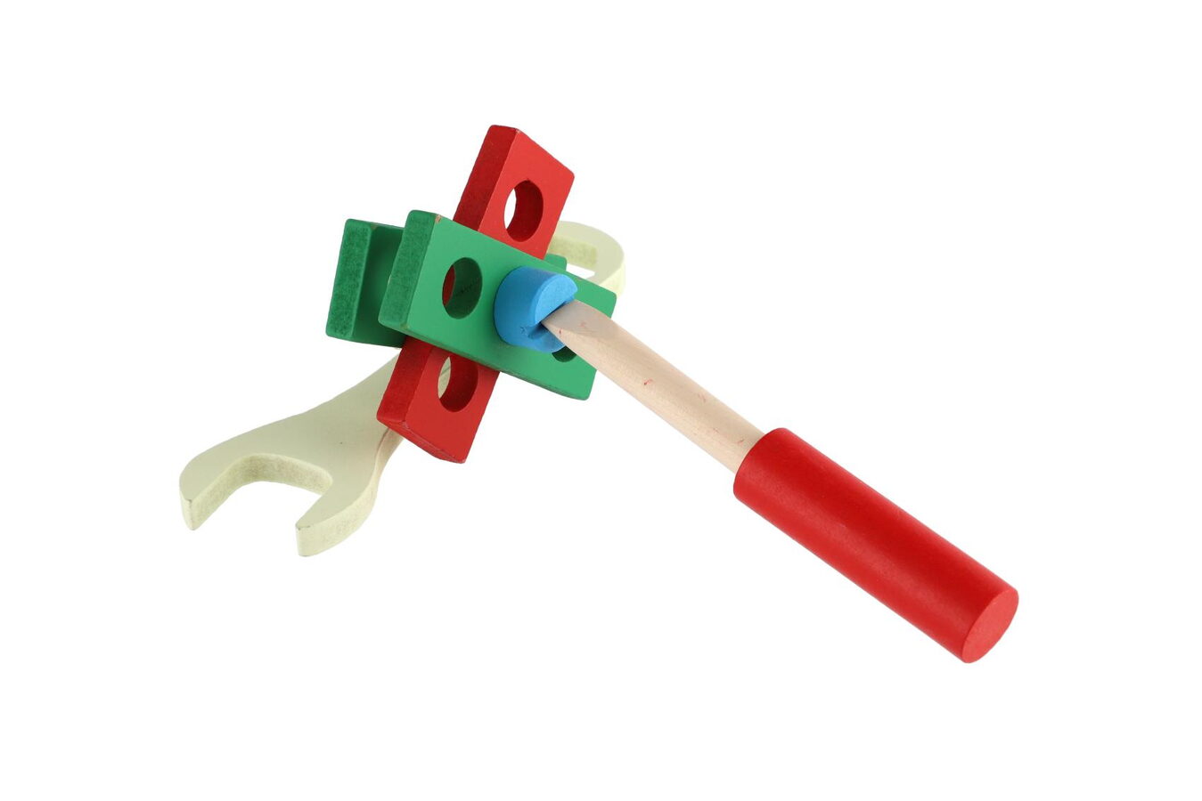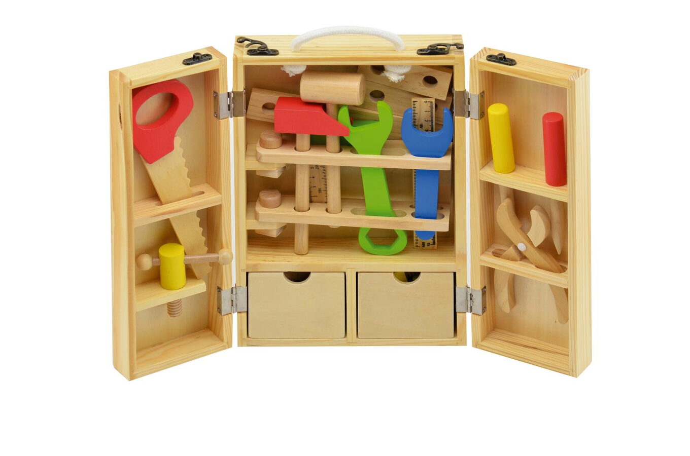 Dřevěný kufřík s nářadím obsahuje šroubováky, kladívka, klíče, matice, šrouby, úhelník, pravítko, pilu a spoustu dalšího. Hračka pomáhá rozvíjet technické chápání a jemnou motoriku rukou. Pro všechny malé kutily.