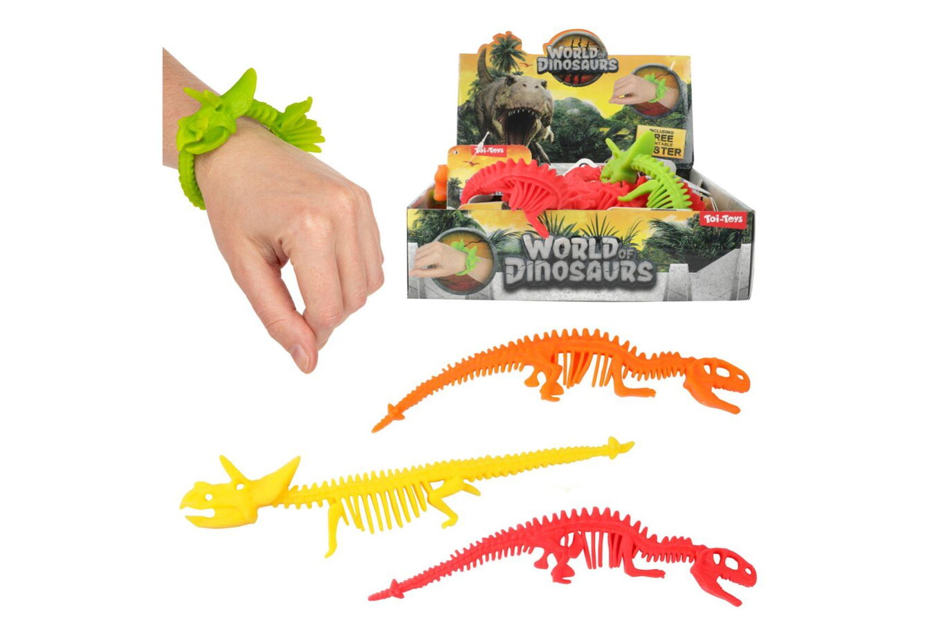 Náramek dinosaurus natahovací mačkací silikon 22cm 4 barvy 24ks v boxu