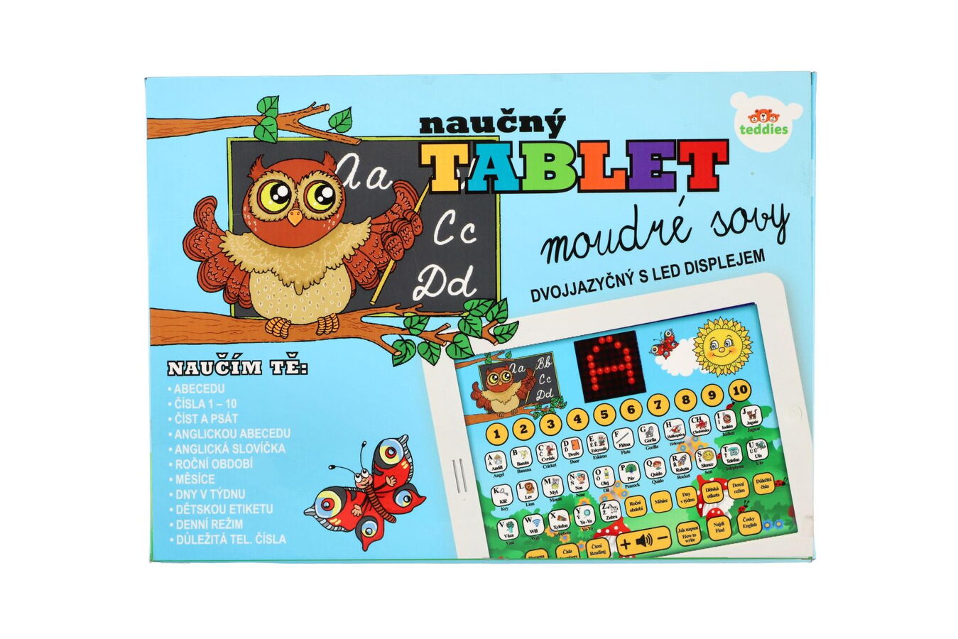 Naučný tablet moudré sovy dvojjazyčný CZ+AJ plast 24x19x2cm na baterie se zvukem v krabici 32x23x3cm
